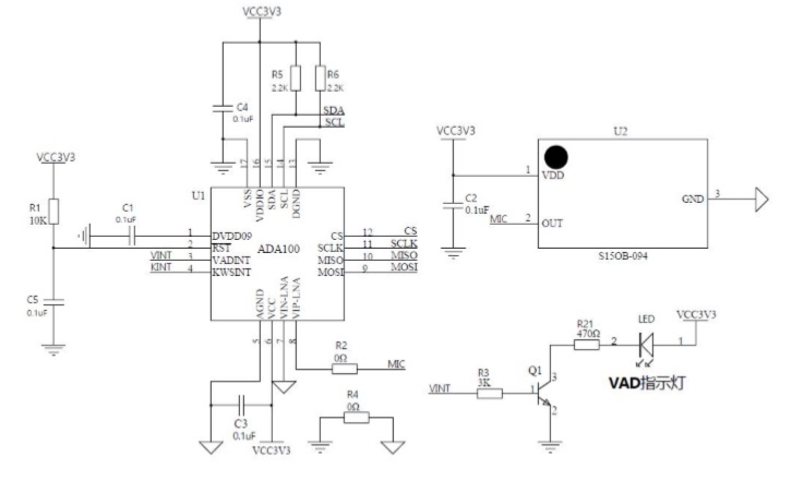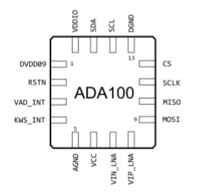 該電路適用于有 I2C 或 SPI 通信的方案,最大支持 30 個關(guān)鍵詞的識別,當有語音時,VADINT(PIN3)輸 出高脈沖指示檢測到人聲;當識別到關(guān)鍵詞時,KWSINT(PIN4)輸出一個納秒級別的脈沖,提示此時該讀取 ADA100 寄存器,提取識別到的關(guān)鍵詞。