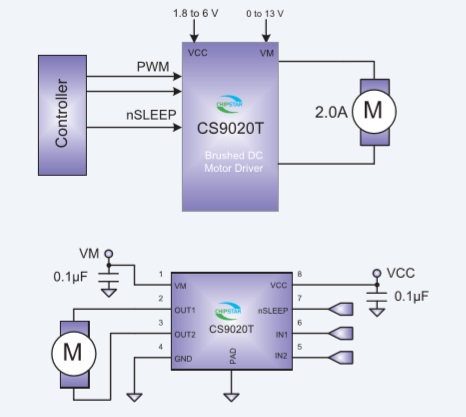 產(chǎn)品名稱: CS9020(1.8V-7V低電壓單通道H橋電機(jī)驅(qū)動芯片)