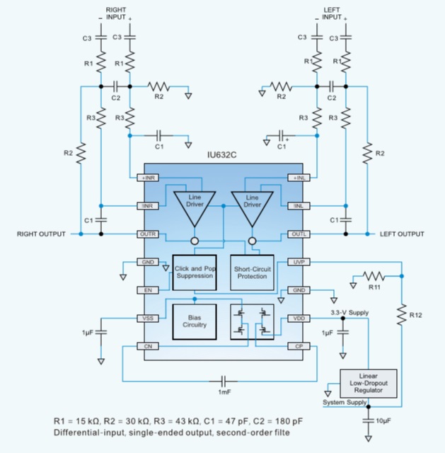 IU632C具有一個(gè)外部欠壓檢測(cè)器, 該欠壓檢測(cè)器在電源被移除時(shí)將輸出靜音,從而確保了無(wú)雜音的關(guān)斷操作。與產(chǎn)生2VRMS/3VRMS輸出的傳統(tǒng)方法相比,在音頻產(chǎn)品中使用IU632C能夠大幅度地減少組件數(shù)量.