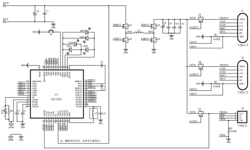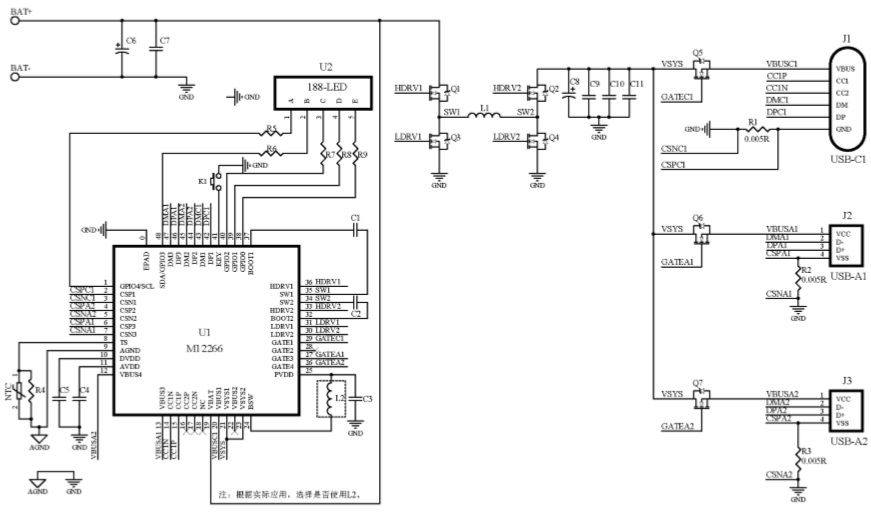 M12266是一款面向多串電芯大功率移動電源應用的專用SOC,集成了同步升降壓電壓變換器、電池充放電管理模塊、顯示模塊、電量計算模塊,提供最大100W輸入/輸出功率,支持PD3.0、QC3.0、AFC、FCP、 SCP、BC1.2 DCP 等主流快充協(xié)議,并提供輸入/輸出的過壓/欠壓、電池過壓/欠壓、過充/過放、NTC過溫、放電過流、輸出短路保護等完備的保護功能。配合極簡的外圍電路,即可組成100W多口移動電源。