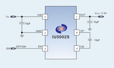產(chǎn)品功能: IU5002S是一個具備低噪聲、恒定開關頻率(650KHz),在2.0V-5.0V供電范圍內(nèi)恒定3.3V輸出、電容式DC-DC轉(zhuǎn)換器。