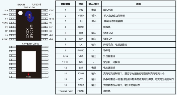 IU5208 支持20W快充的3節(jié)串聯(lián)鋰電池升壓充電芯片 EQA-16 3.6V-9V 集成30V OVP,支持20W快充,最大1.3A充電電流NTC及使能功能,3節(jié)串聯(lián)鋰電升壓充電管理芯片 IU5207