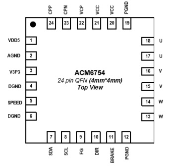 ACM6753 18V、3A三相無(wú)刷無(wú)感驅(qū)動(dòng)、180˚正弦,集成驅(qū)動(dòng)算法+預(yù)驅(qū)+MOS QFN-24 5V-18V 5-18V無(wú)感三相無(wú)刷電機(jī)驅(qū)動(dòng)器 ACM6754