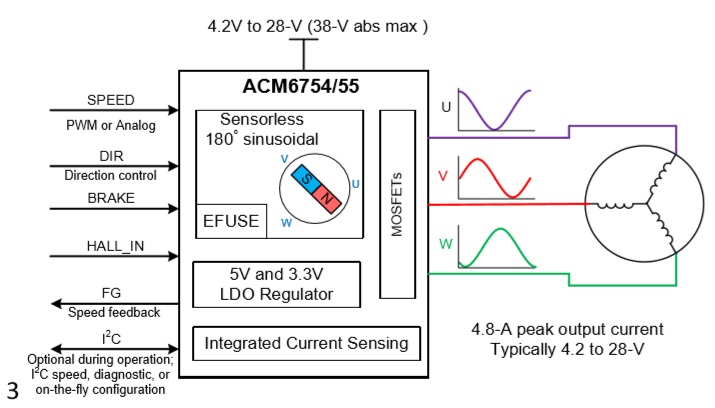 ACM6754是一款三相無(wú)刷直流電機(jī)驅(qū)動(dòng)芯片,內(nèi)部集成無(wú)感三相無(wú)刷電機(jī)驅(qū)動(dòng)算法、相電流檢測(cè)電流電路、柵極驅(qū)動(dòng)電路以及功率MOS管. 支持最大4.8A的相電流. ACM6754/55 的高集成度以及精簡(jiǎn)外圍特別適用于高功率密度、小尺寸、靜音要求高的三相無(wú)刷電機(jī)驅(qū)動(dòng)器
