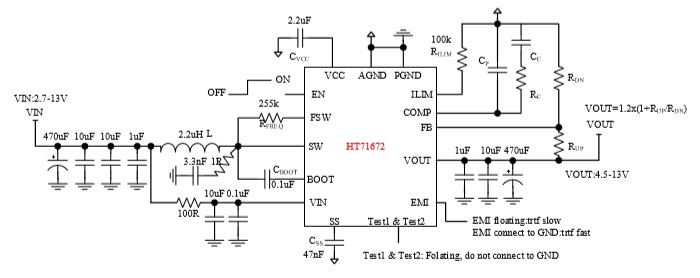 HT71672具有2.7V至13V寬輸入電壓范圍,可為采用單節(jié)或兩節(jié)鋰電池的應用提供支持。該器件具備12A開關電流能力,并且能夠提供13V的輸出電壓。