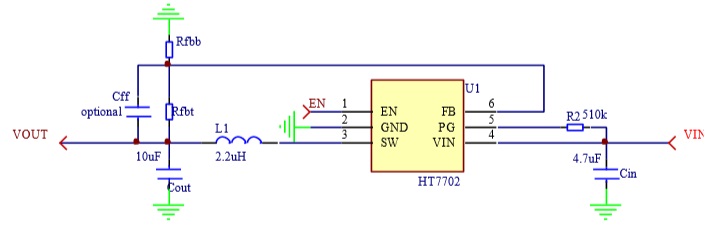 該器件在中到重載時,工作在典型開關(guān)頻率為1.5MHz的PWM模式;在輕載時,器件工作在高 效節(jié)能模式。 輸出電壓可通過外部電阻調(diào)節(jié)。 HT7702采用SOT23-6封裝。