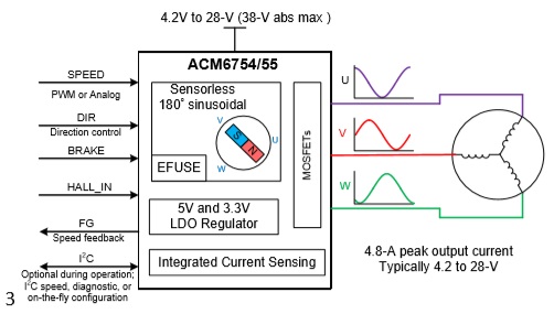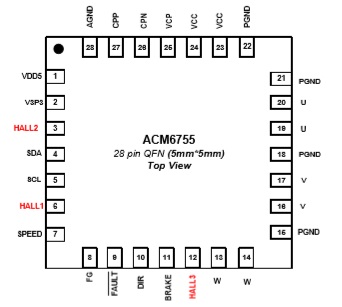 產(chǎn)品名稱(chēng): ACM6755(4.5V-28V工作電壓、4.8A相電流、支持3霍爾應(yīng)用的三相BLDC無(wú)刷直流電機(jī)驅(qū)動(dòng)芯片)