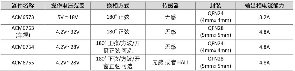 ACM6763 4.5V-32V、5A三相無(wú)刷無(wú)感驅(qū)動(dòng)、180˚正弦,集成驅(qū)動(dòng)算法+預(yù)驅(qū)+MOS QFN-28 4.5V-32V 三相180˚ 正弦, 無(wú)感或單霍爾,車(chē)規(guī)級(jí)無(wú)刷電機(jī)驅(qū)動(dòng) ACM6755