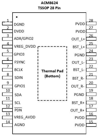 ACM8831 1×135W, 單聲道輸出 (4Ω, 32V, THD+N = 10%) TSSOP-28(散熱片朝上) 4.5V-34V 內(nèi)置DSP、I2S數(shù)字輸入135W大功率單聲道D類功放IC