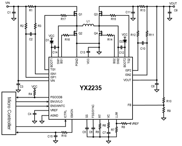 產(chǎn)品名稱: YX2235(4V-35V輸入、2V-35V輸出,大電流同步升降壓控制器芯片)