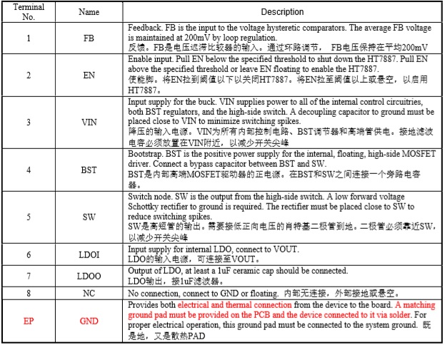 開(kāi)關(guān)頻率可高達(dá)1MHz,從而允許小尺寸的外圍器件。過(guò)熱保護(hù)和短路保護(hù)(SCP)使芯片具有較好的可靠性和容錯(cuò)機(jī)制。200µA的靜態(tài)電流允許HT7887用于電池供電的應(yīng)用中。