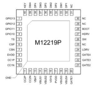 產(chǎn)品名稱: M12219P(集成PD3.0/QC3.0等主流快充協(xié)議、單節(jié)鋰電池移動電源30W雙向快充芯片)