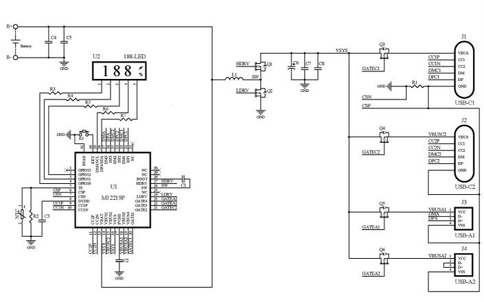 M12219P 是一款面向單電芯30W移動電源應(yīng)用的專用 SOC,集成了同步開關(guān)升壓變換器、電池充放電 管理模塊、顯示模塊、電量計算模塊,支持 PD3.0、QC3.0、AFC、FCP、SCP、BC1.2 DCP 等主流快充協(xié)議,并提供輸入/輸出的過壓/欠壓、電池過充/過放、NTC 過溫、放電過流、輸出短路保護(hù)等完備的保護(hù)功能。配合極簡的外圍電路,即可組成支持188-屏顯示功能的30W多口移動電源。