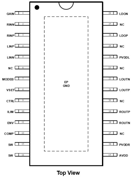 產(chǎn)品功能: 輸出功率(fIN=1kHz, RL=4Ω, BTL) ; VBAT = 4V, 2×10.6W (VOUT=9V, THD+N = 10%) ; VBAT = 4V, 2×8.6W (VOUT=9V, THD+N= 1%)