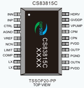 CS83815 PO at 10% THD+N, VIN = 6.5-12.6V RL = 4 Ω+22uH 31W TSSOP-20 6.5V-12.6V 適用于2-3節(jié)雙節(jié)鋰電池應(yīng)用、AB/D類切換、升壓模式同步異步可選,自適應(yīng)內(nèi)置升壓單聲道35W功放IC CS83812